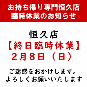 人員不足のため恒久店を臨時休業とさせていただきます。2月8日(日)終日ご迷惑をおかけしますがよろしく