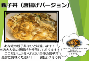 いつもご覧いただきましてありがとうございます!!あなたの街の定食屋さん清武店の高木です♪▼唐揚げ親子