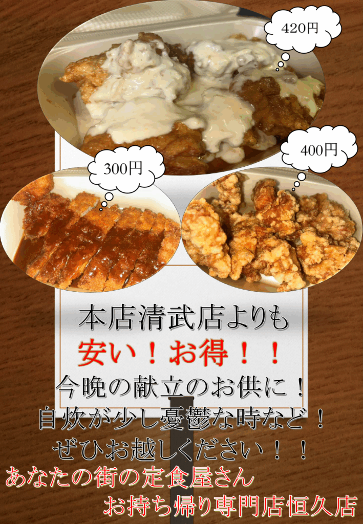 そんなお料理が面倒な時はあなたの街の定食屋さんお持ち帰り専門店へどうぞ!