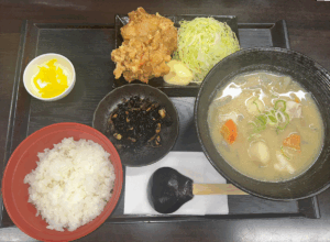 熱々の具だくさんの豚汁に唐揚げが付いた満腹定食!
